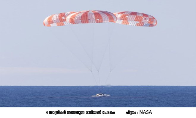 4 യാത്രികർ അടങ്ങുന്ന ഓറിയൺ പേടകം ഇന്ത്യൻ സമയം പുലർച്ചെ 5.37നാണ് യുഎസിലെ കലിഫോർണിയയ്ക്കു സമീപം പസിഫിക് സമുദ്രത്തിലിറങ്ങിയത്. അപ്പോളോ ദൗത്യങ്ങൾക്ക് ശേഷം മനുഷ്യൻ ചന്ദ്രനിലേക്ക് നടത്തിയ ഏറ്റവും വലിയ കുതിപ്പിന്റെ ശുഭസമാപ്തിയാണിത്. യുഎസിൽനിന്നുള്ള റീഡ് വൈസ്മാൻ, വിക്ടർ ഗ്ലോവർ, ക്രിസ്റ്റീന കുക്ക്, കാനഡക്കാരൻ ജെറമി ഹാൻസൻ എന്നിവരാണു തിരികെയെത്തിയത്. അരനൂറ്റാണ്ടിനിപ്പുറം മനുഷ്യരെ വഹിച്ച് ചന്ദ്രനെച്ചുറ്റിയ ദൗത്യമെന്ന പെരുമനേടിയാണ് ആർട്ടിമിസ് 2 ഭൂമിയിലിറങ്ങിയത് . യുഎസ് നാവിക സേനയും റസ്ക്യൂ ടീമും പേടകത്തിനടുത്തെത്തി. യുഎസ്എസ് ജോൺ പി. മർത്ത എന്ന റെസ്ക്യൂ കപ്പലാണ് പേടകം വീണ്ടെടുക്കാനെത്തിയത്. യാത്രികരെ പേടകത്തിൽനിന്ന് കപ്പിലേക്കു മാറ്റാനുള്ള ശ്രമങ്ങൾ തുടരുന്നു