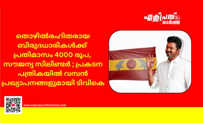 “തൊഴിൽരഹിതരായ ബിരുദധാരികൾക്ക് പ്രതിമാസം 4000 രൂപ, സൗജന്യ സിലിണ്ടർ”; പ്രകടന പത്രികയിൽ വമ്പൻ പ്രഖ്യാപനങ്ങളുമായി ടിവികെ